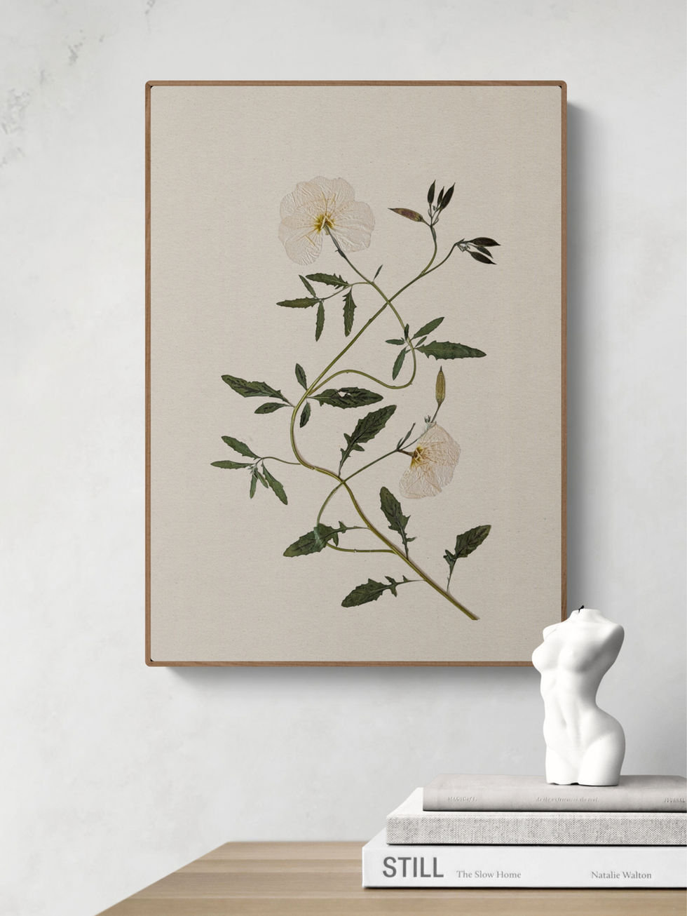 הפרח מוצמד לנייר מסוג Fine Art נטול חומצה 300 גר׳, בצבע מוקה בהיר עם טקסטורה עדינה, ממוסגר במסגרת איכותית בעלת פרופיל עדין, עם זכוכית אנטי- רפלקטיבית (מוזאלית) המקטינה את רוב ההשתקפויות ומגינה מקרינת UV.